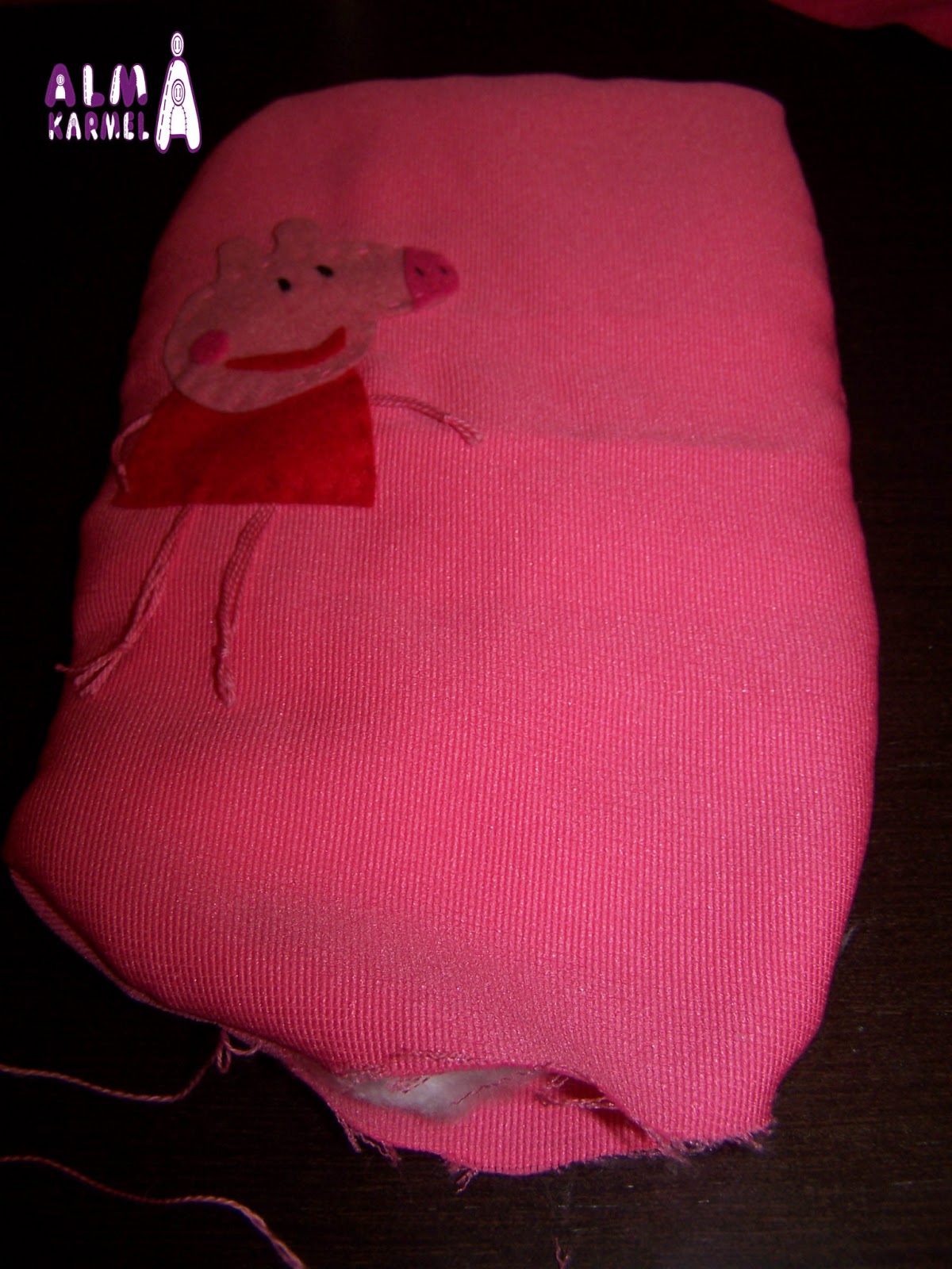 Como es para mi niña, que es una seguidora fiel de Peppa Pig, su mami le ha hecho una para adornarle el protector, en la foto lo tengo presentado donde lo voy a coser después. En esta ocasión las manos y pies se las he hecho con cuerda, pero sin colocarle ninguna bolita, ya que le podía molestar.